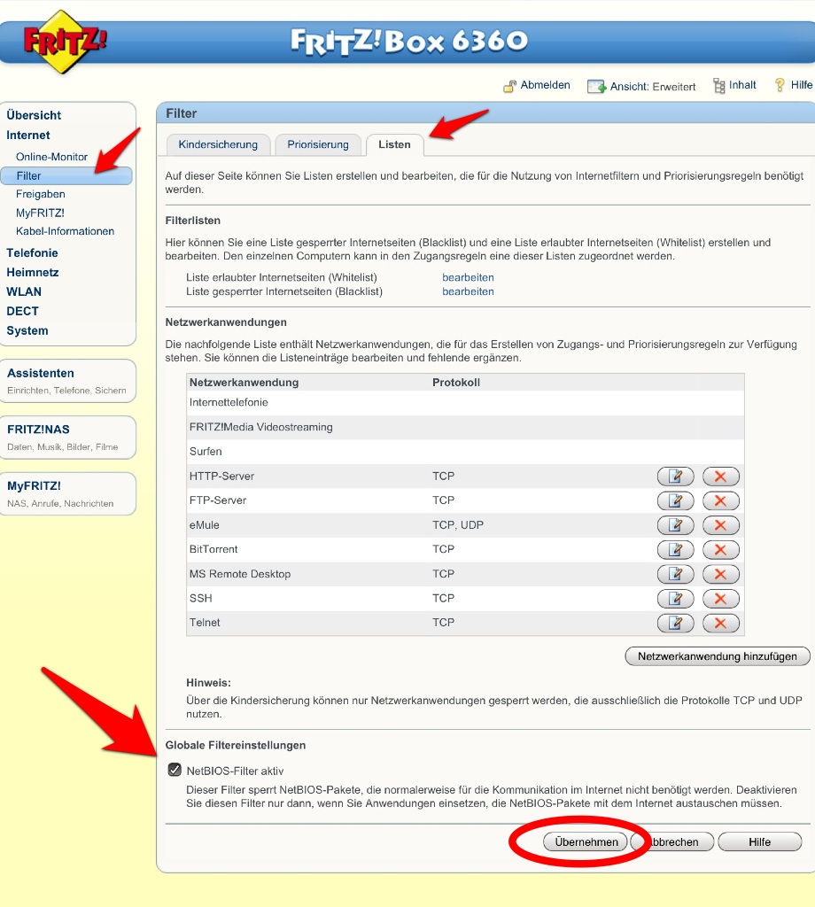 Update December 16, 2013: The ‘NetBIOS’ section disappeared in the FRITZ!Box 6360 settings, I think due to a firmware update. However, you can manually turn off ‘NetBIOS’: