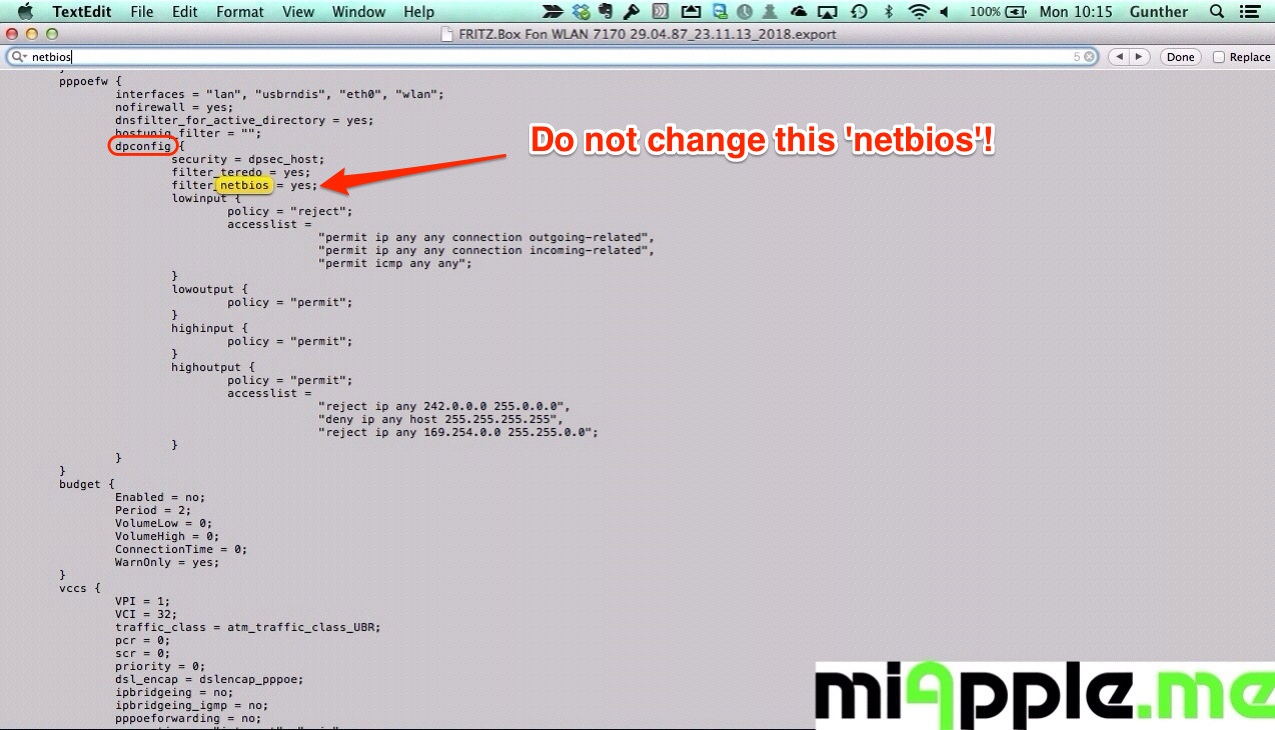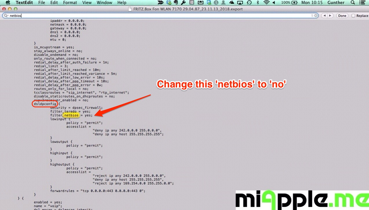 - Open this file with a text editor an look for the line ‘filter_netbios = yes‘. Take care that you choose the correct line because ‘filter_netbios = yes‘ appears (at least) 2 times. The correct one is below ‘dsldpconfig‘. Do not choose the one near by ‘dpconfig‘! Safe the file.