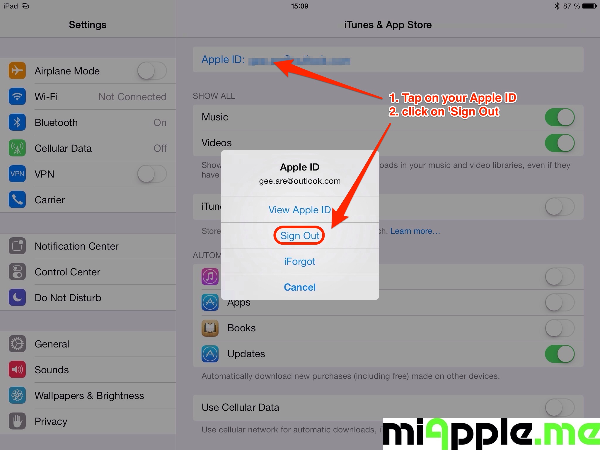 - Go to ‘Settings‘, ‘iTunes & App Store‘, tap on your ‘Apple ID‘ and sign out.