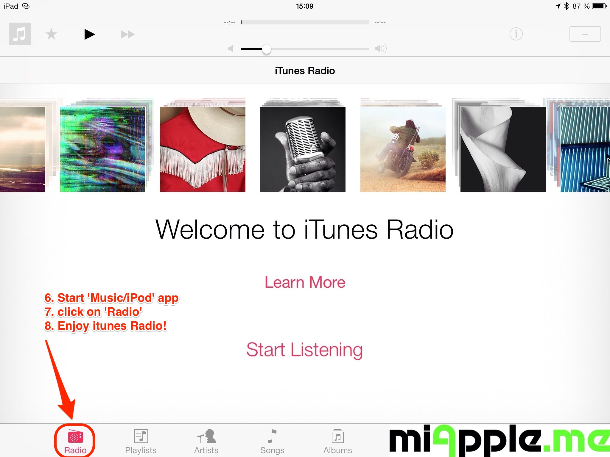 - Go to the ‘Music‘ app / iPod app. If the app was running before signing out and in, you have to close it by double clicking on the iPhone home button and swiping with a finger from down to up. Restart the ‘Music’ app and iTunes Radio will start.