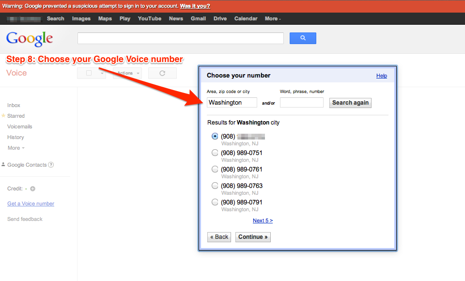 8. Choose a number, e.g. type ‘Washington’ to get numbers shown. Select one and click ‘Continue’. Click on ‘Call Me Now’. Google Voice will call your local number and this should ring the X-Lite softphone on your computer. Enter the confirmation code shown (2 digits) using the dial pad of X-Lite and once it is verified, your Google Voice phone number is ready for use.