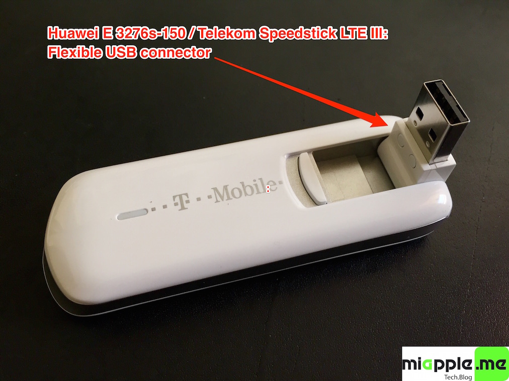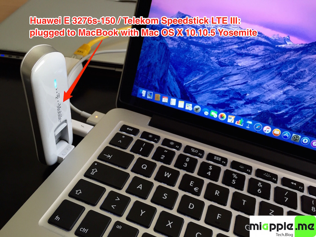 Huawei E3276s-150 T-Mobile Surfstick III_01_Flexible USB connector Huawei E3276s-150 T-Mobile Surfstick III_02_rear panel Huawei E3276s-150 T-Mobile Surfstick III_03_Micro SD and antenna slots Huawei E3276s-150 T-Mobile Surfstick III_04_interior with card slot and model information Huawei E3276s-150 T-Mobile Surfstick III_05_plugged to MacBook with Mac OS X 10.10.5 Yosemite - Huawei Mobile Connect Driver for Mac, update for MacBook air (MobileConnectDriver for Mac Book Air 2013, 2013-08-31, software version 4.25.45.00)