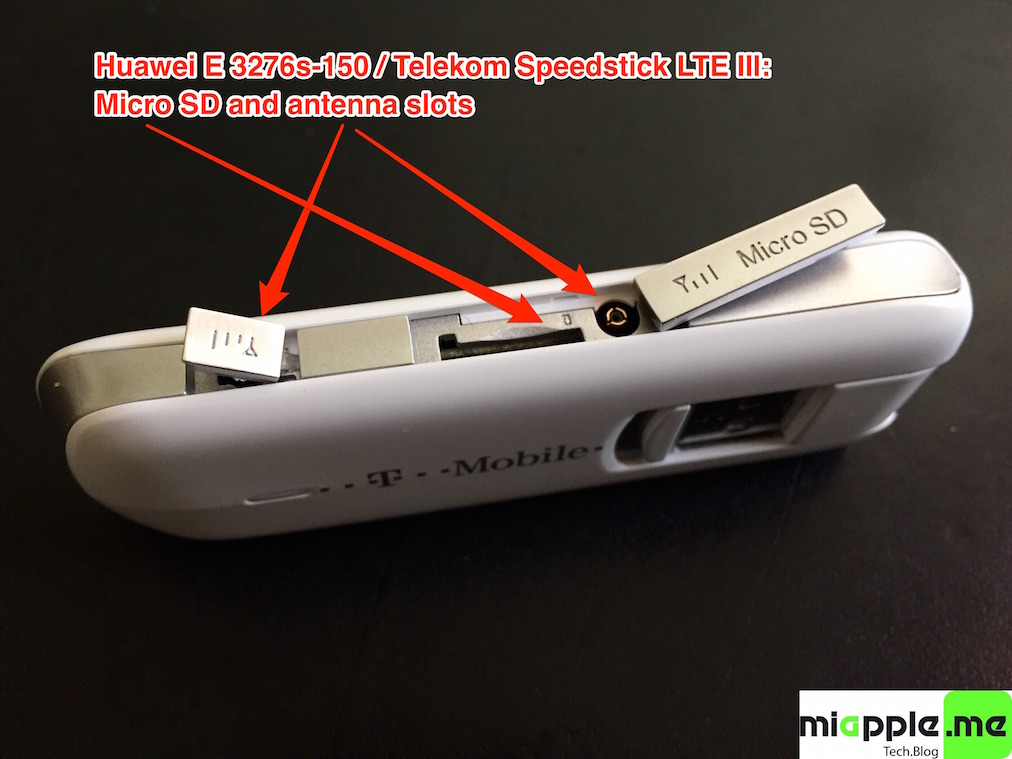 - Huawei E3276s-150 / Telekom Speedstick LTE III / HiLink / OmanTel modem USB stick (LTE Cat4 DL at up to 150Mbp: 4G LTE FDD – B20/B8/B1/B3/B7 800/900/1800/2100 / 2600Mhz, 3G HSDPA/HSUPA/UMTS/WCDMA – 900 / 1900 / 2100Mhz) with micro SD slot and two hidden connectors for external antenna (Specifications Huawei E3276):