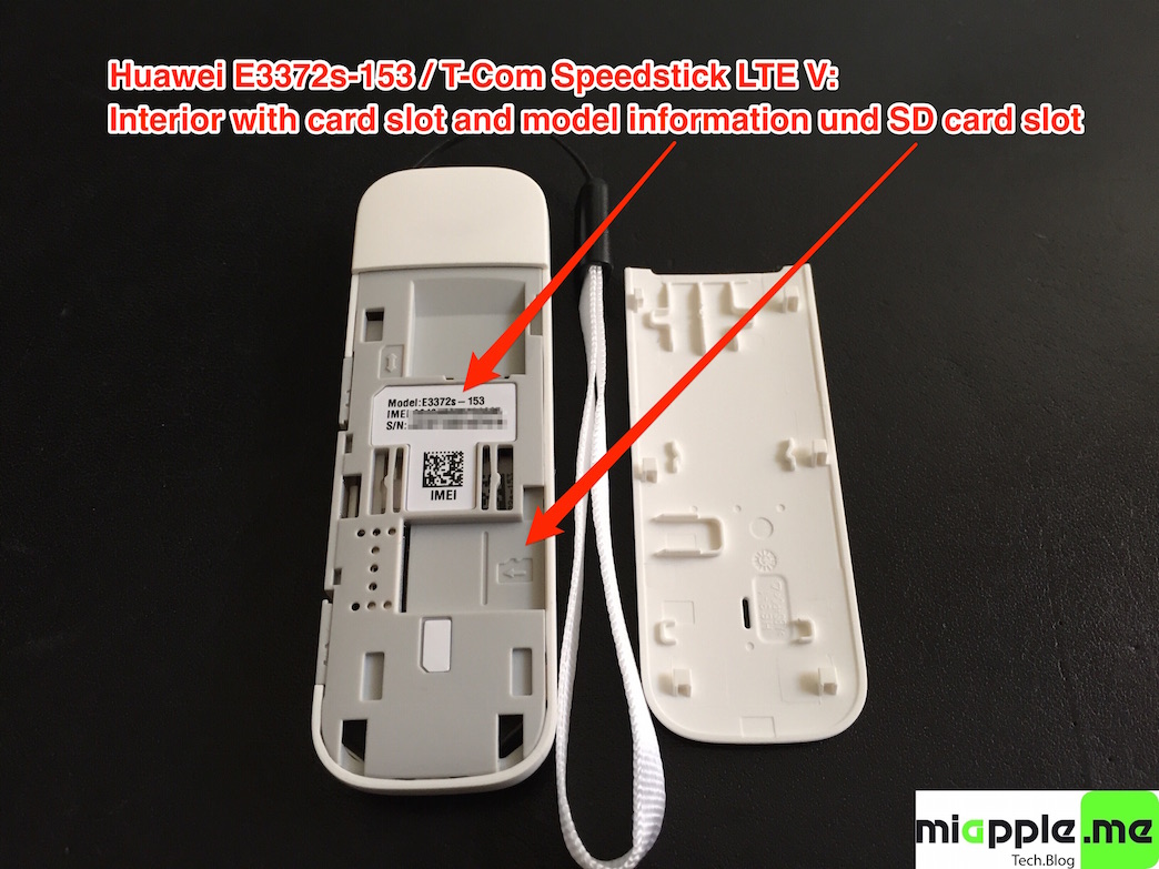 - Huawei E3372s-153 / Telekom Speedstick LTE V (LTE FDD : Cat4 DL:150Mbps/UL:50Mbps @20M BW, UMTS: DCHSPA+:42/5.76Mbps;21M/5.76Mbps;14M/5.76M, HSUPA:7.2M/5.76M, 2G: EDGE packet data service of up to 236.8kbps) with micro SD slot and two hidden connectors for external antenna (Specifications Huawei E3372):
