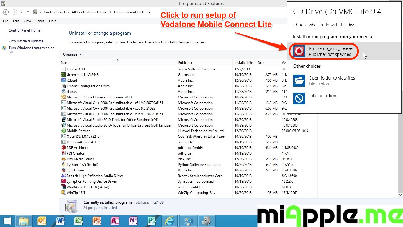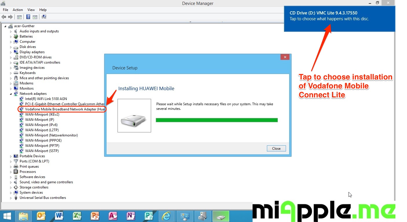 Source: miApple.me Source: miApple.me Source: miApple.me Source: miApple.me Source: miApple.me Source: miApple.me Source: miApple.me Source: miApple.me - Insert the SIM-card, connect the Huawei / Vodafone K3765-HV to your Windows 8 / Windows 8.1 PC and wait until ‘Tap to choose what happens with that disc‘ is prompted. Then tap on it.