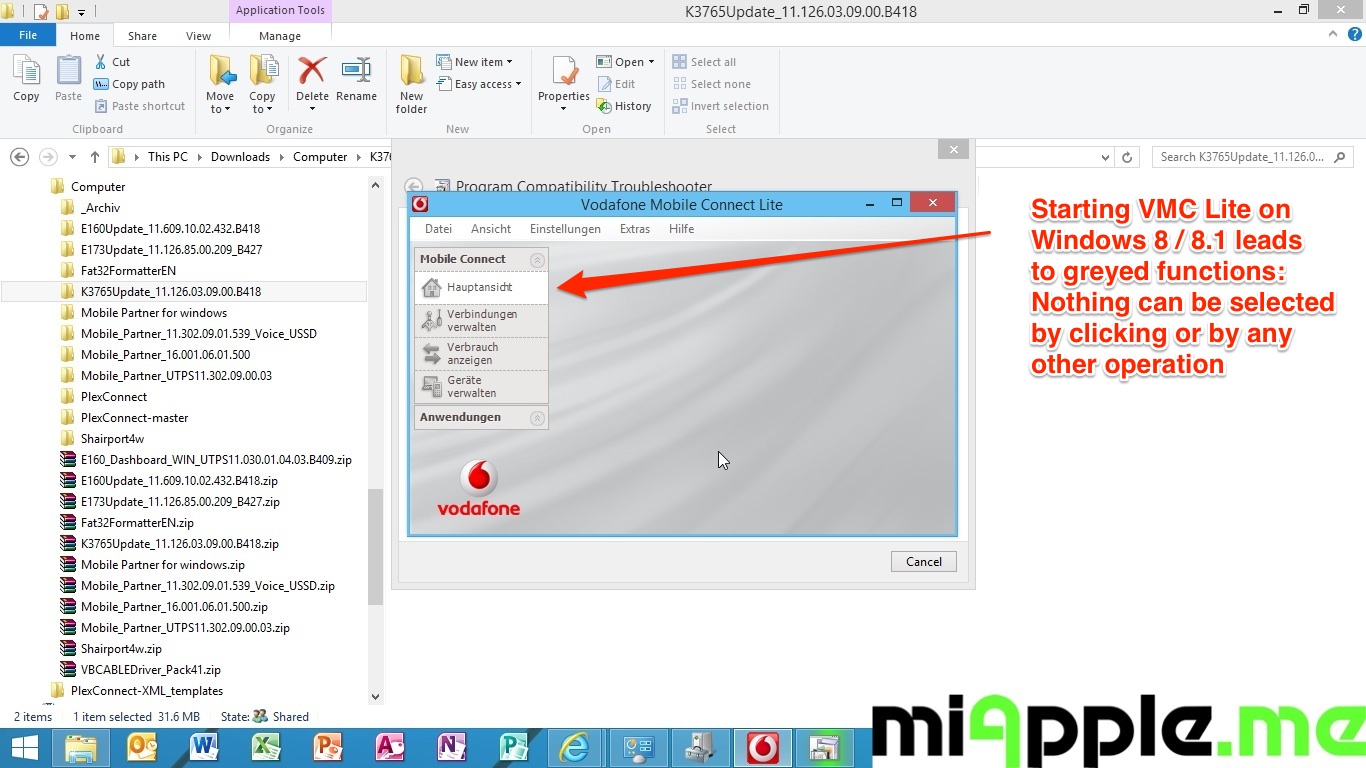 - After the installation is finished, start Vodafone Mobile Connect. You will see all taps and functions greyed meaning you cannot select anything: Vodafone Mobile Connect is not running on Windows 8 / 8.1. However, the driver for K3765 had been installed.
