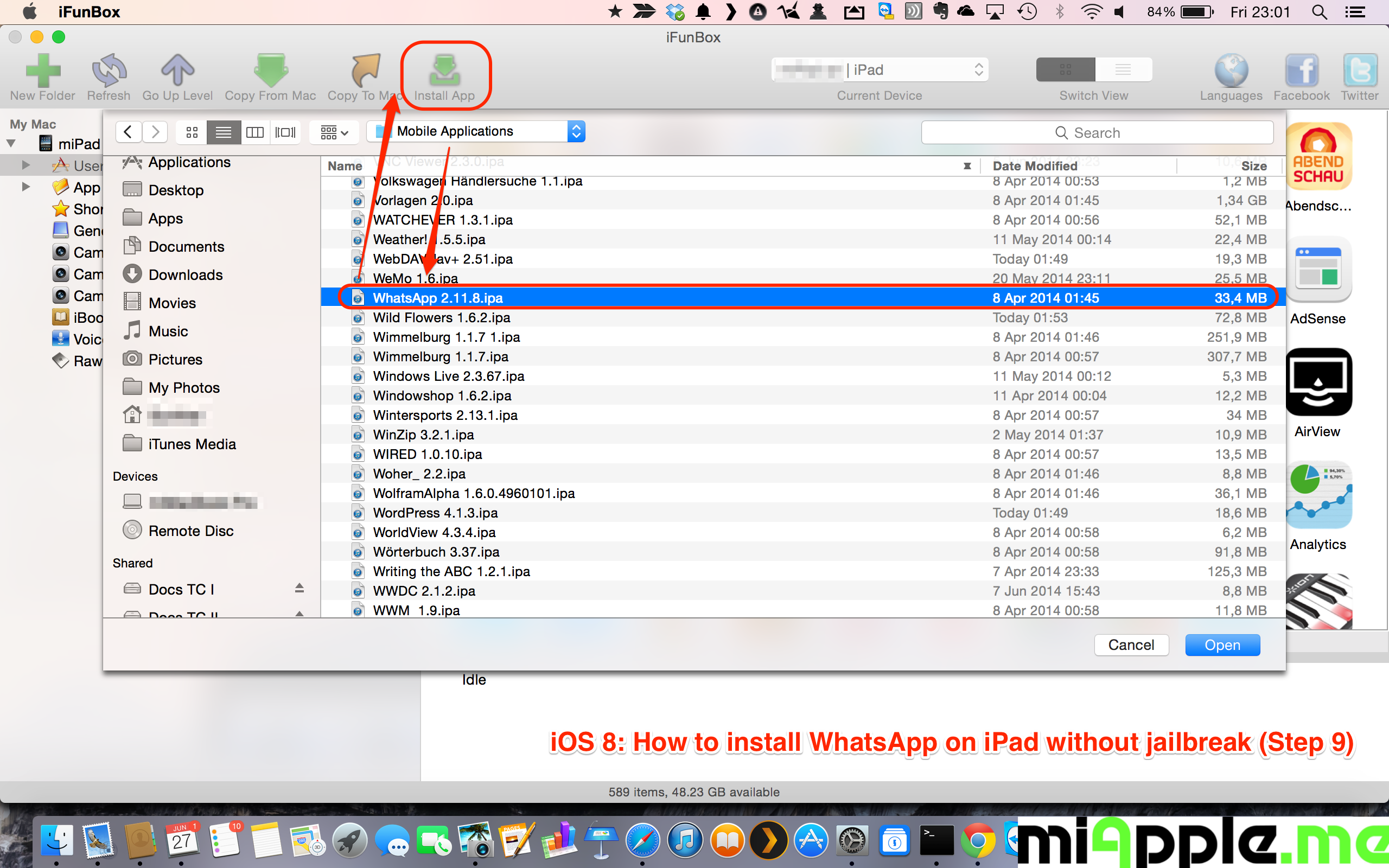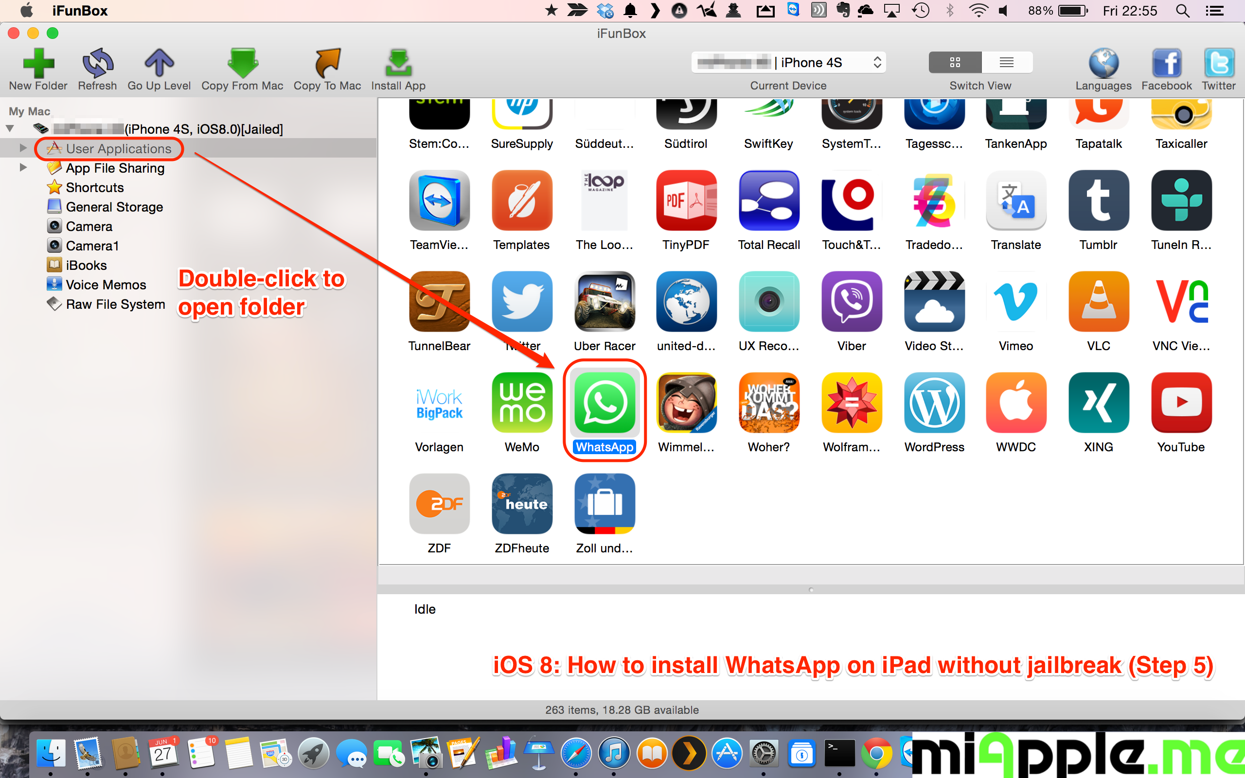 WhatsApp on iPad without jailbreak is easily installed on iOS 7 and iOS 8 (iPod touch included) using the free iFunBox (Windows and Mac versions available). I tried also DiskAid, but it didn’t worked. However, there is a known issue with WhatsApp on iOS 8 beta: Some contacts or groups force WhatsApp on iOS 8 beta to crash. This is a general problem of WhatsApp on iOS 8 and has nothing to do with this tweak.