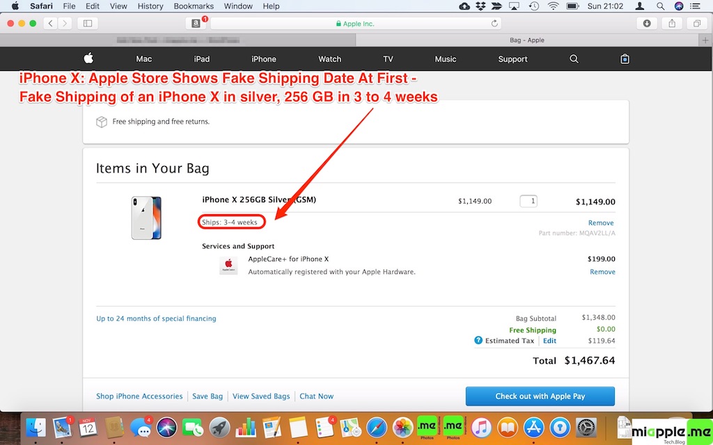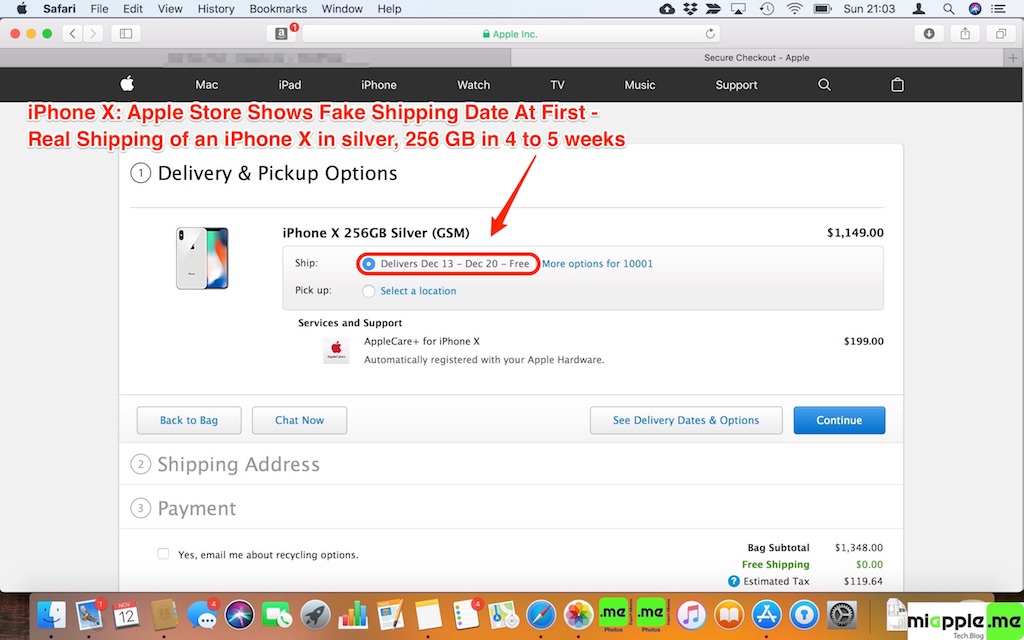 iPhone X shipping times are displayed at 3 to 4 weeks on the Apple Store (U.S.). Indeed, the real and confirmed shipping date is far later. On November 12, 2017, Putting a iPhone X, silver, 256 GB into the bag at the Apple store shows shipping forecast at 3 to 4 weeks. If you proceed the buying process, the shipping g is dated December 13 to December 20, 2017. This means a shipping in more than 4 to 5 weeks.
