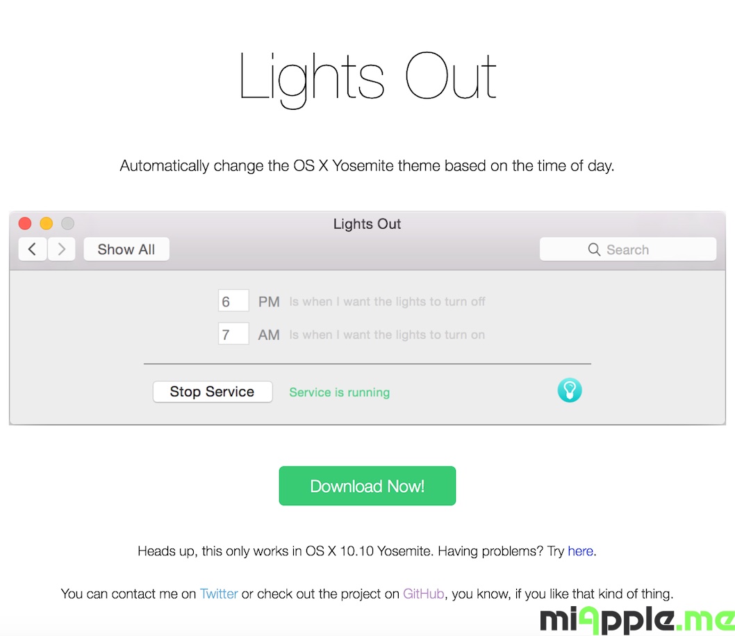 Lights Out Preferences Service is not running, Source: miApple.me - Now you can select the time of beginning and ending of the Dark Mode. In the other time the Light Mode is on. Click on ‘Start Service‘ to activate Lights Out. Done!