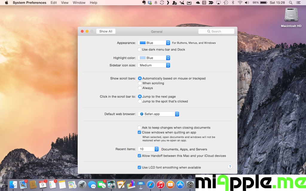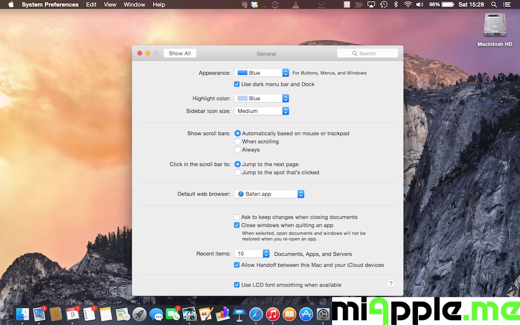 On your Mac, go to the Apple icon, click on ‘System Preferences‘, click on ‘General‘ and select ‘Use dark menu bar and dock‘ for the Dark Mode. If you want to use the Light Mode again, de-select it. In the following screen shots you see the difference between Light Mode (left) and Dark Mode (right):