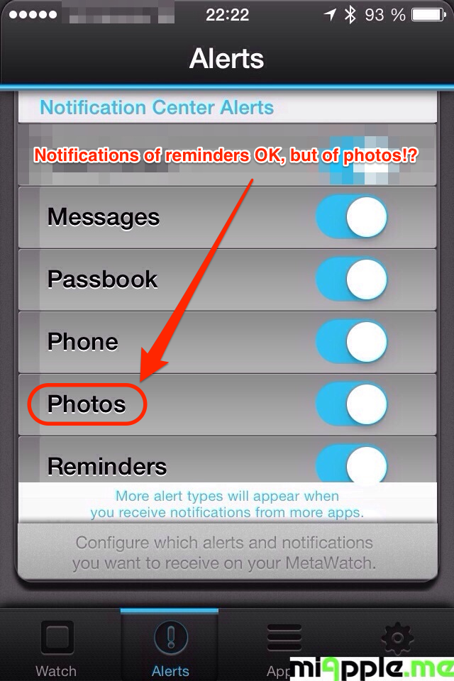As I have already posted, MetaWatch Manager version 1.2.5 does not work on iOS 7 (beta, Golden Master). On September 18, 2013, MetaWatch Manager 1.3 and the new MetaWatch Firmware 1.5 were released. I checked it out immediately: MetaWatch Manager now works prefectly on my iPhone 4S running on iOS 7. However, you have to update the firmware , too (requires Mac OS X 10.4 Lion or Windows). Further more, the MetaWatch Manager 1.3 is now pushing all notifications of your iPhone to your MetaWatch (iOS 7 required)! iOS7 seamlessly connects the MetaWatch to all push notifications (if notifications are activated on iPhone settings). MetaWatch Manager also includes a new feature called MetaFilter, a dynamic filtering system that learns what apps are enabled on the phone and then lets users choose which ones can forward notifications to the wrist. MetaWatch officially points out the following the possibilities: