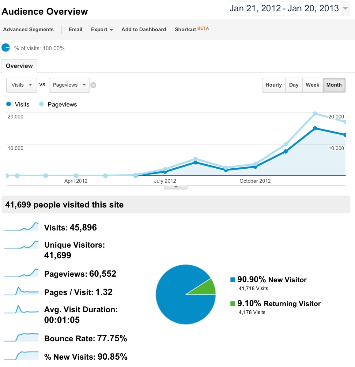 The numbers of visitors decreased in September, but the next push came with my articles in November about Windows 8 and my struggle to get Apple apps like iTunes or iCloud running on my Acer machine. The highlight of the first year is, without any doubt, December 2012: