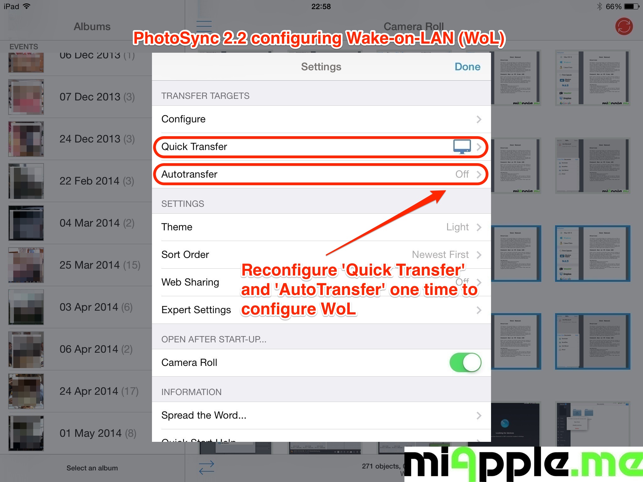 PhotoSync 2.2 for iOS (iPhone, iPad, iPod touch) update adds Wake-On-LAN (WoL) support for Autotransfer and Quick transfer to computer, support for Toshiba Canvio Wireless Adapter and hierarchy view for SmugMug. PhotoSync 2.2 is not published yet, but will be released within the next days. (Update: PhotoSync 2.2 was released on May, 19, 2014.)