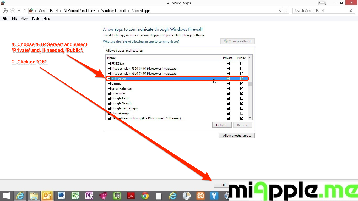 4. Choose ‘FTP Server‘ and select ‘Private‘ for your home network and, if needed, ‘Public‘ for access from outside your home network. Then Click ‘OK‘. Done!