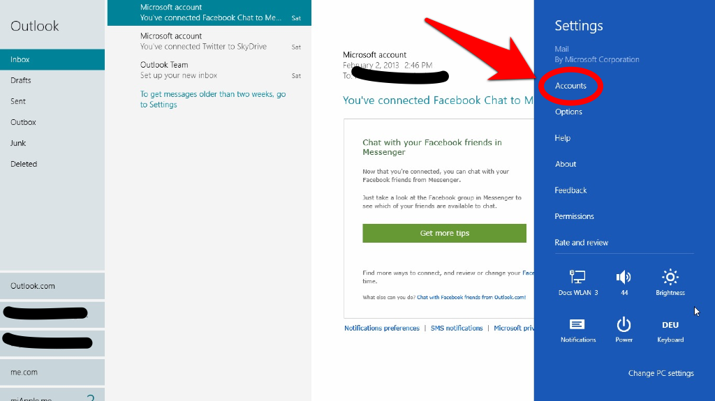 - On your Windows 8 PC open the Mail App and choose via the charm bar on the right hand side “Settings”: