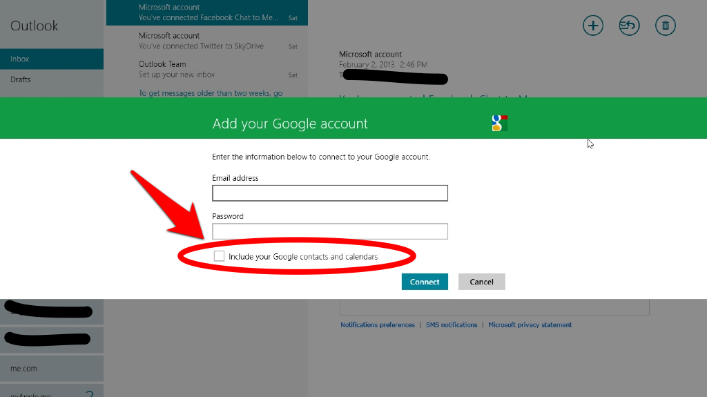 - Add your Gmail email address and your Password, but DO NOT choose “Include your Google contacts and calendars” because it will cause syncing problems for your emails. If you choose it, Windows 8 automatically uses the ActiveSync protocol which is disabled by Google in Gmail for new accounts and new devices. If not, Windows 8 takes the IMAP protocol.