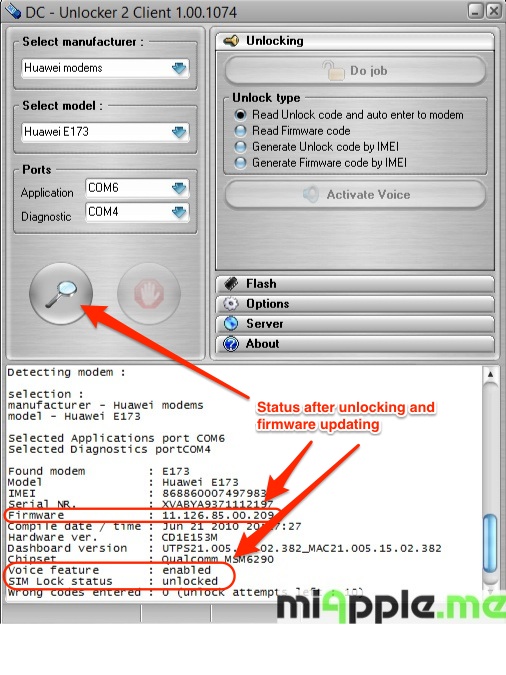 Source: miApple.me Source: miApple.me Source: miApple.me Source: miApple.me Source: miApple.me Source: miApple.me Source: miApple.me - Restart DC-Unlocker, select manufacturer ‘Huawei‘, select model ‘Auto detect (recommended)‘ and then click on the magnifier icon to run the DC-Unlocker detection: Now the detection results is that voice feature is ‘enabled‘ and that the SIM lock status is still ‘Locked (Card Lock)‘.