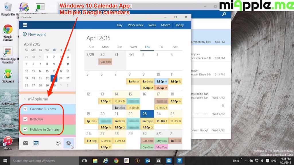Windows 10 will natively support CalDAV and CardDAV protocol for iCloud calendars, iCloud contacts, Google calendars and Google contacts. The previous work-around for iCloud calendars via ‘read-only’ subscription on Outlook.com is not necessary anymore. The Windows 10 Mail and the Calendar app is already working on Windows 10 (Insider preview, build 10130), the Windows 10 People app is still crashing, but it looks like it will support CardDAV.